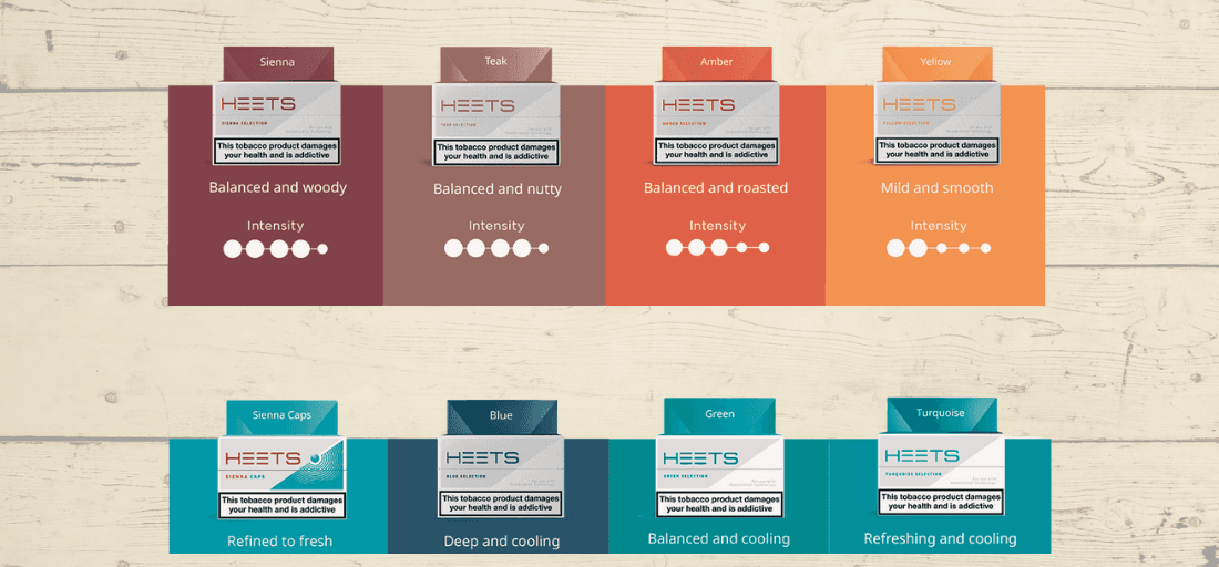 - Wide variety of flavours – Choose from a range of flavours including HEETS Amber, Purple, Yellow, Blue, Sienna, Turquoise, Teak, Green, and Russet.